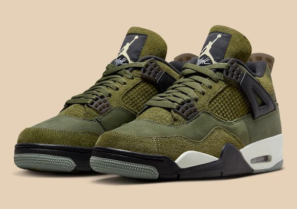 Light green hits are found on the mudguard and eyestays, while we see a darker toned olive on the toebox, collar, and heel. For the wings on the lacing setup, we see the TPU and leather portions both receive a black finish that matches the tongue tag and heel tab. As for Jumpman branding, the logo is doused in a pale vanilla shade. Also like the previous AJ 4 Craft, a lone patch of suede is added to the collar portion, this time found in a tonal green shade. Rounding out the design is the white and black midsole paired with a black and grey outsole.